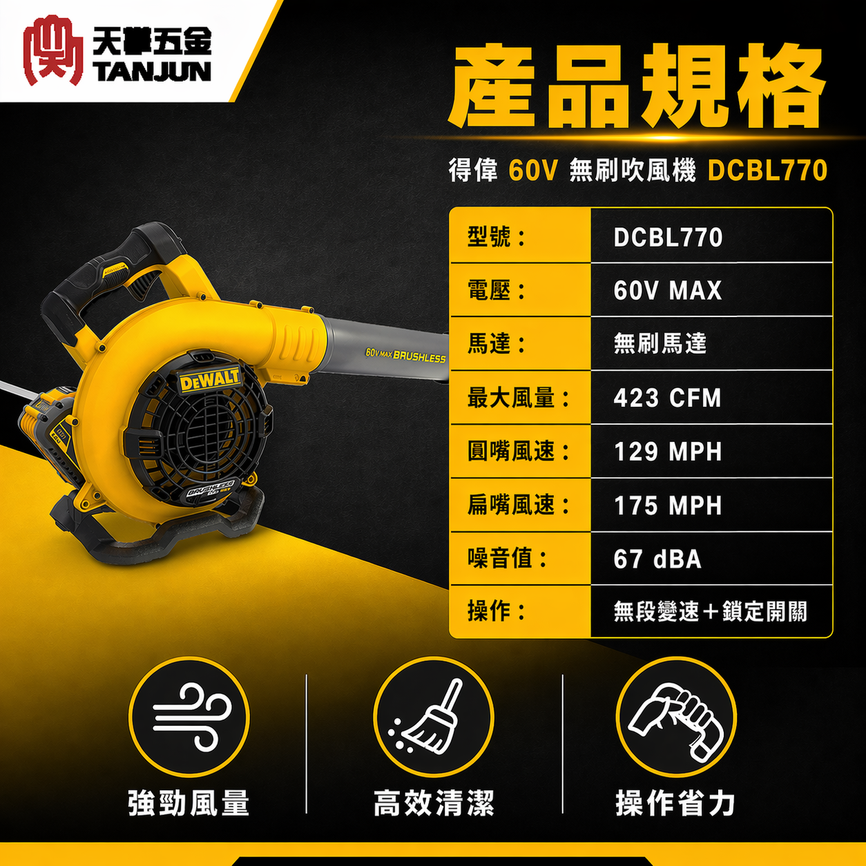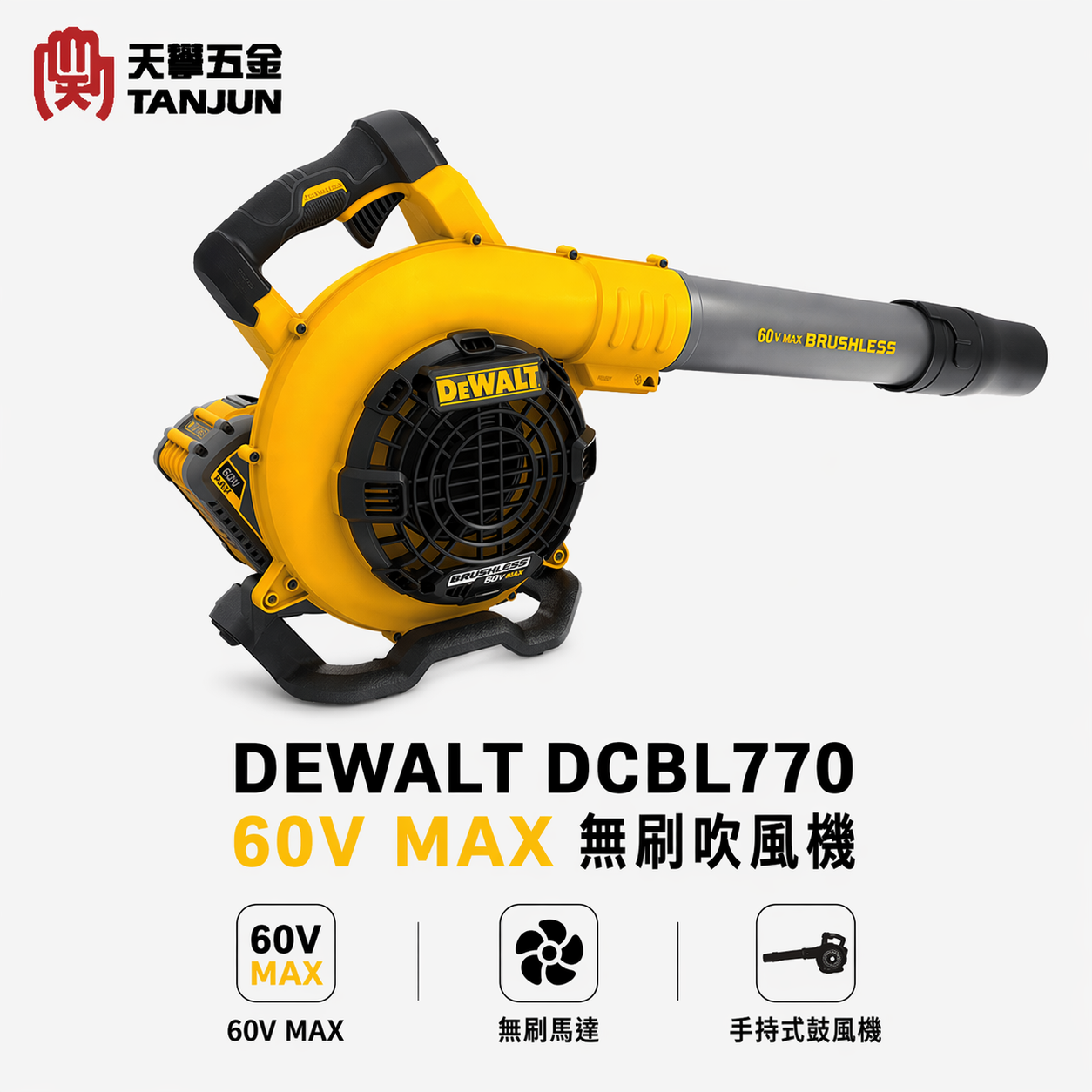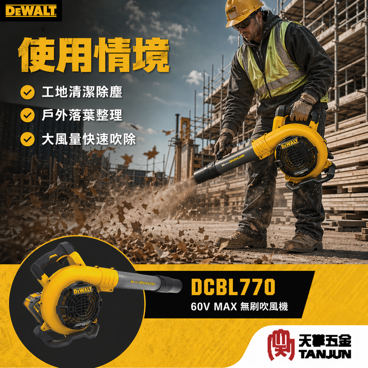 得偉60V無刷吹風機 DCBL770,採用 DEWALT FLEXVOLT 60V MAX 平台,適合工地吹塵、木屑清理、裝修現場整理與戶外落葉碎屑清除使用。