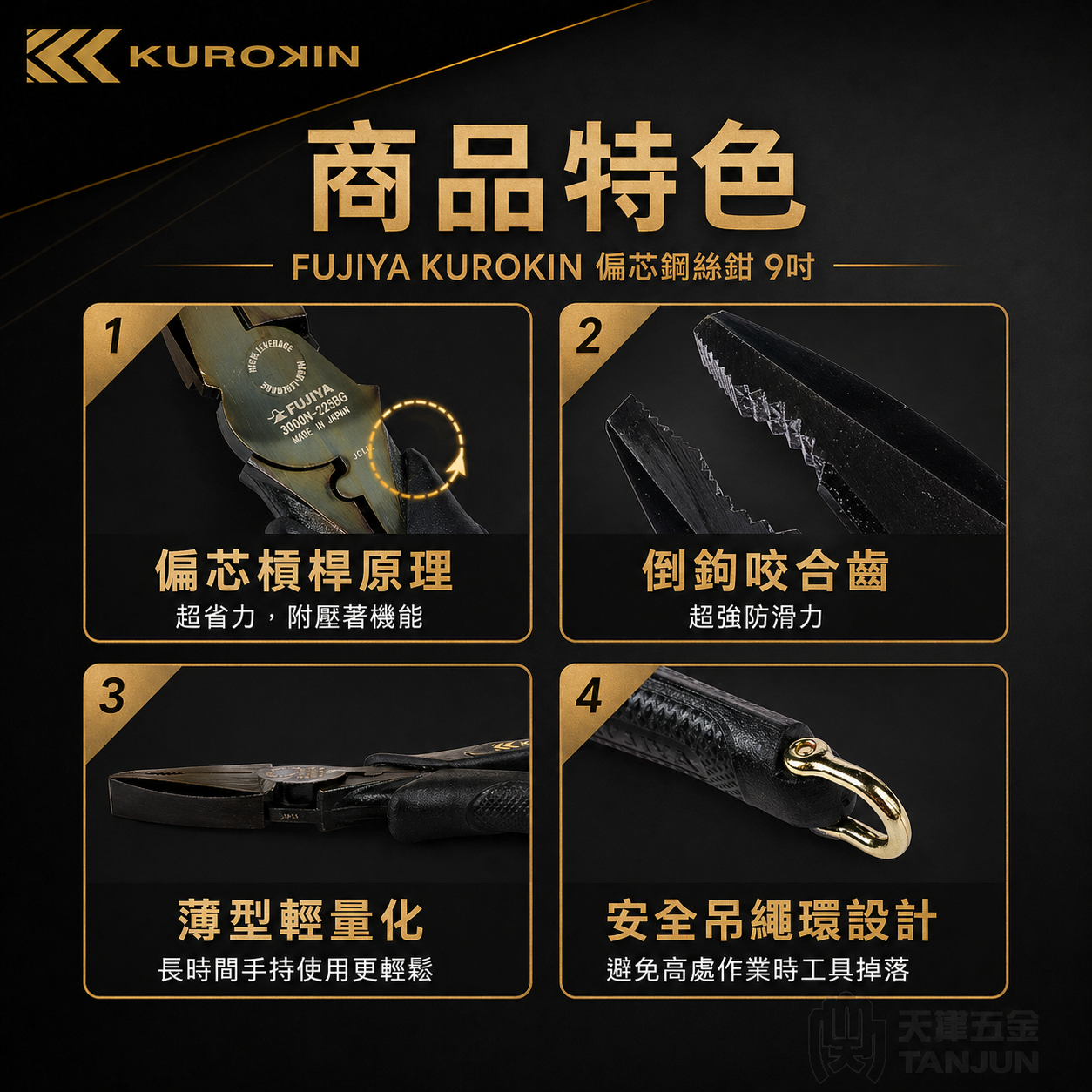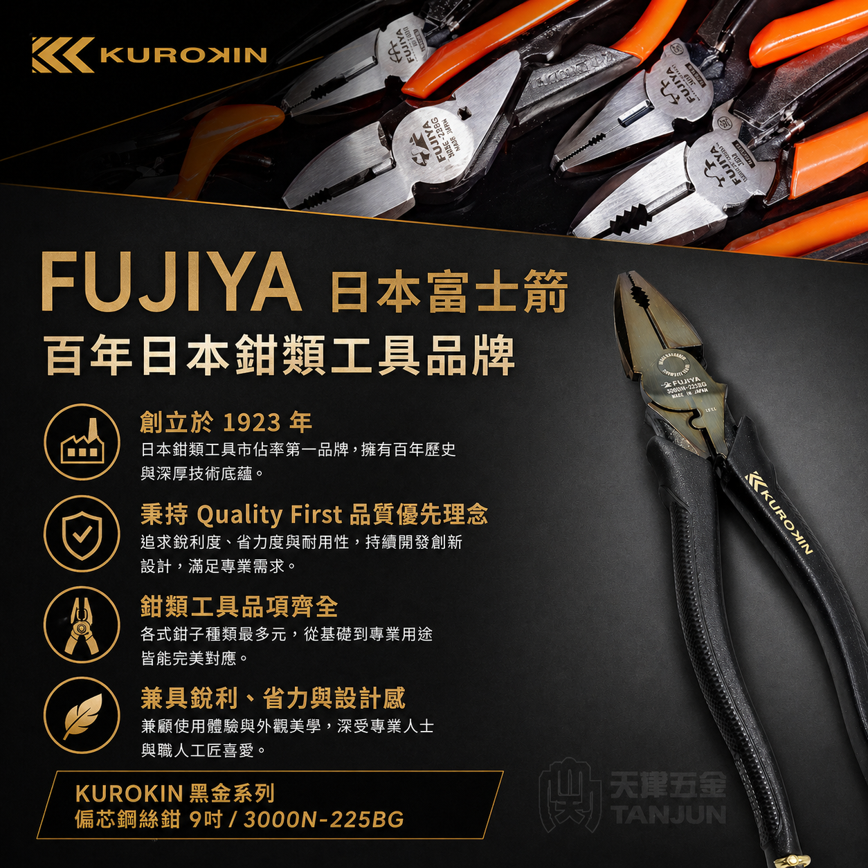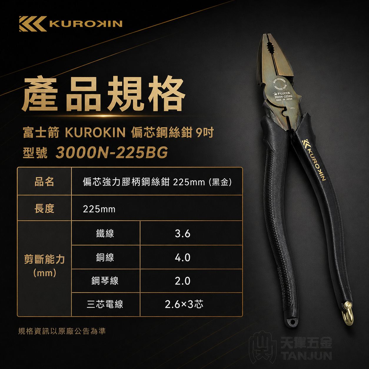 - FUJIYA 富士箭 KUROKIN 黑金系列 3000N-225BG 偏芯鋼絲鉗,9吋/225mm規格,適合專業施工使用