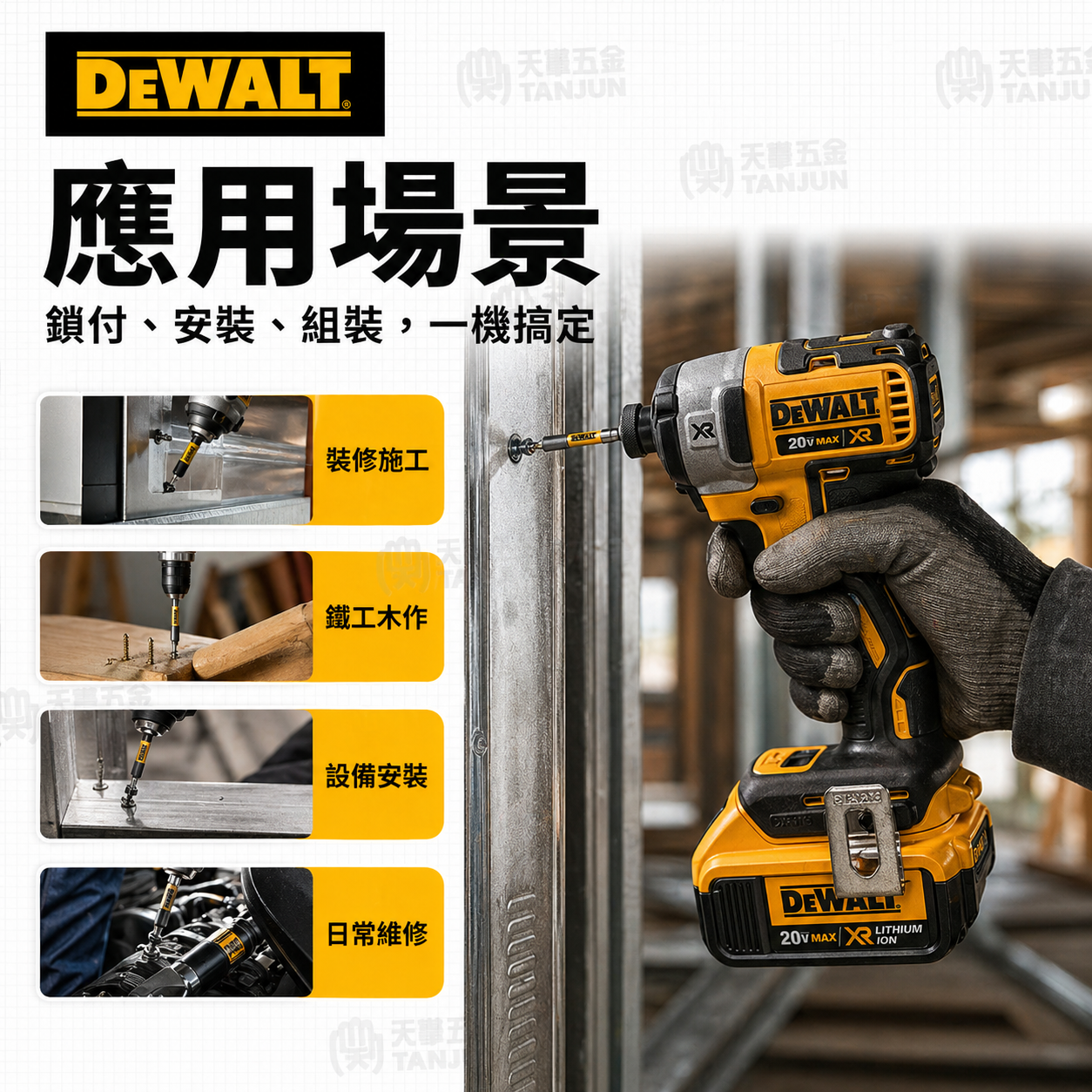 ・得偉20V無刷衝擊起子機 DCF887,適合鎖螺絲、裝修、木工、鐵工與工地施工使用。