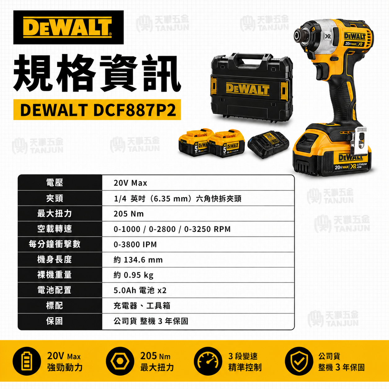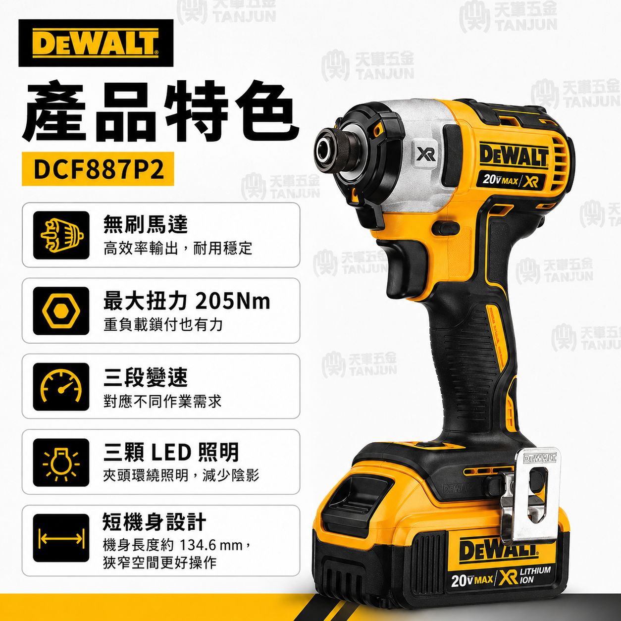 DEWALT、德偉、DCF887N、DCF887P2、887、887N、887P2、Dewalt 887、Dewalt 887N、Dewalt 887P2、205Nm、三段速、三段扭力、六角夾頭、快拆夾頭、鋰電工具、工地施工、木工、鐵工、鎖螺絲