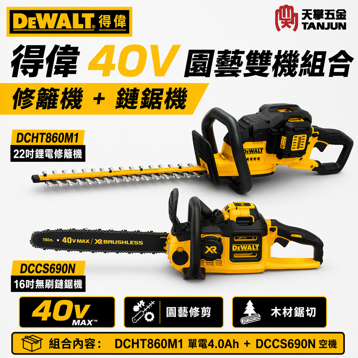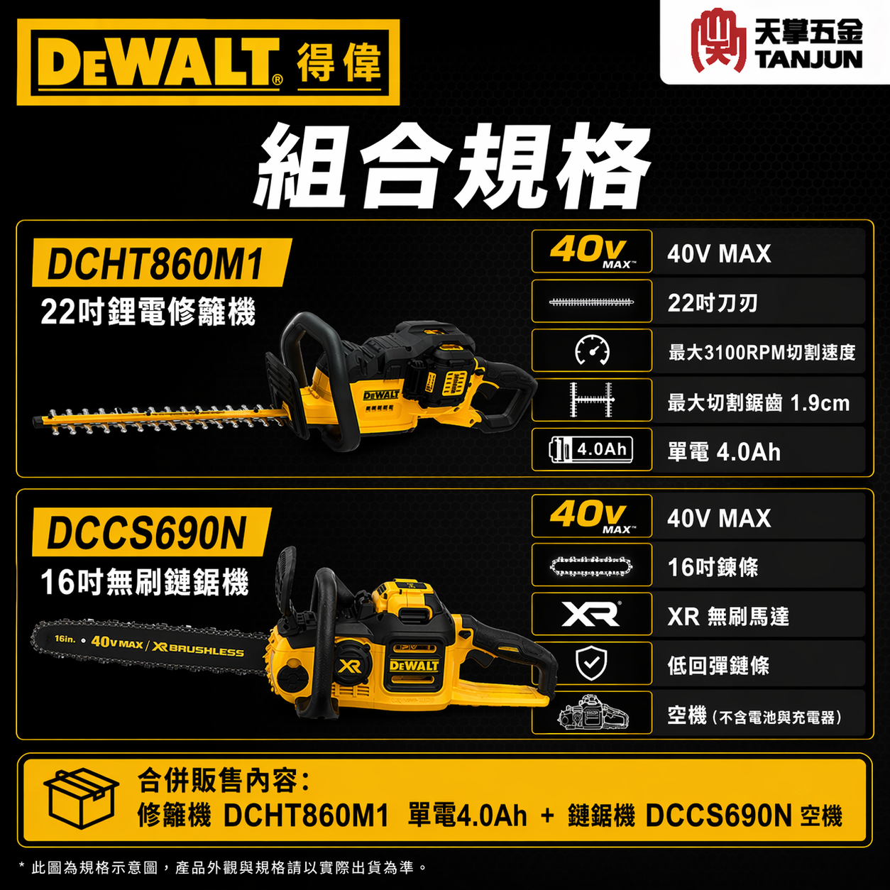 - 內容包含:DCHT860主機 + DCCS690N 空機 + 40V4.0Ah電池x1 + 40V充電器x1