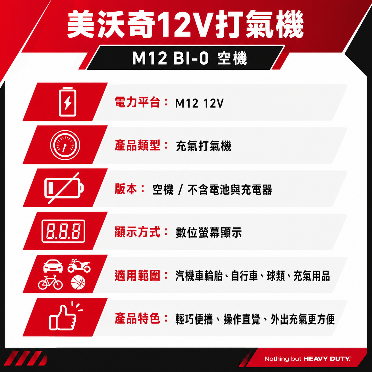 美沃奇 M12 BI-0 12V打氣機採用無線鋰電設計,體積輕巧、攜帶方便,適合日常胎壓補充、戶外活動與緊急充氣使用。搭配M12系列電池即可使用,免接電源線,操作更靈活。