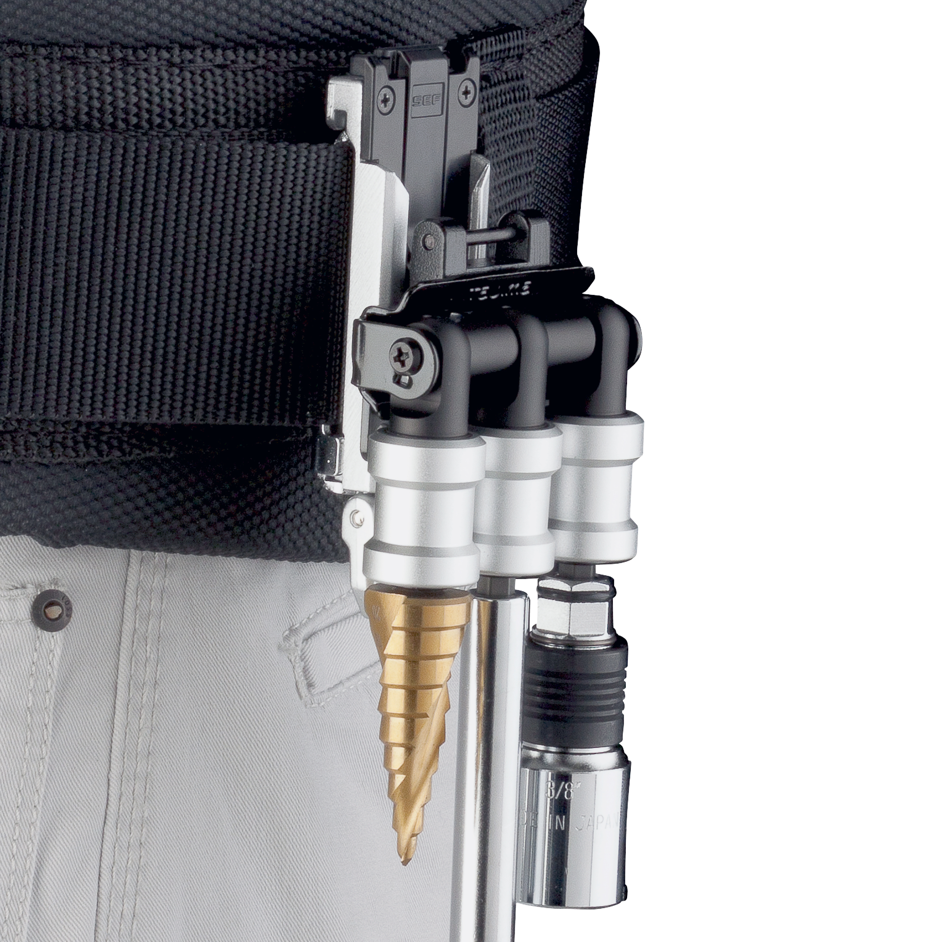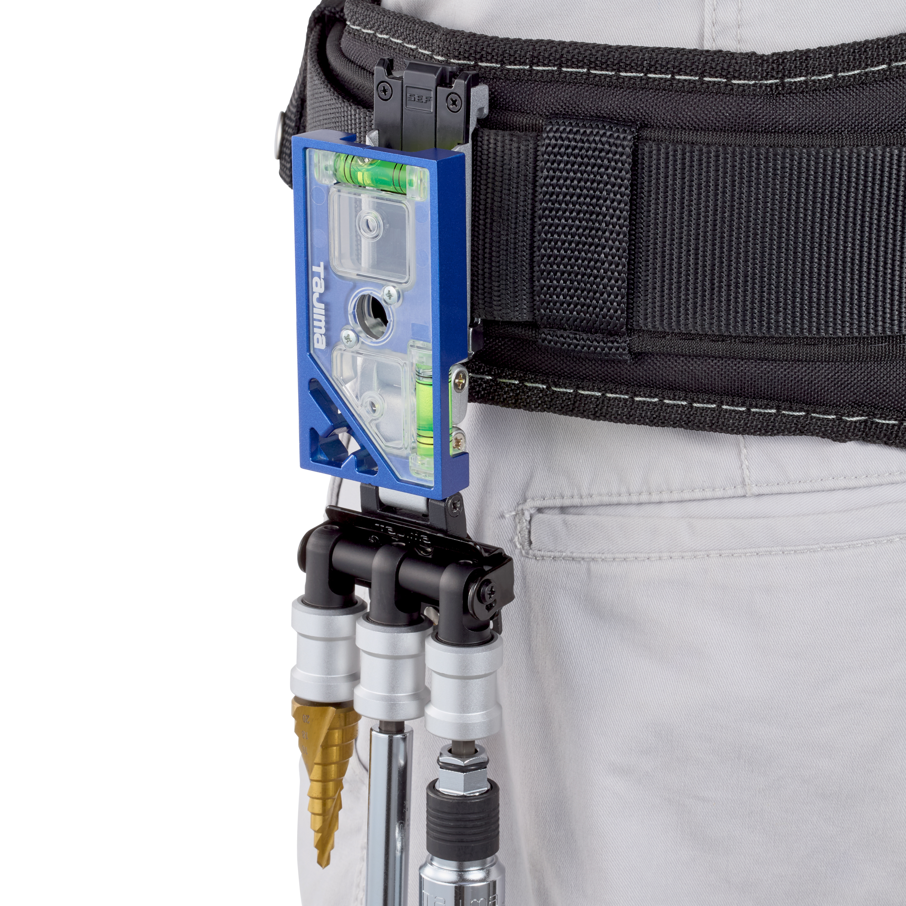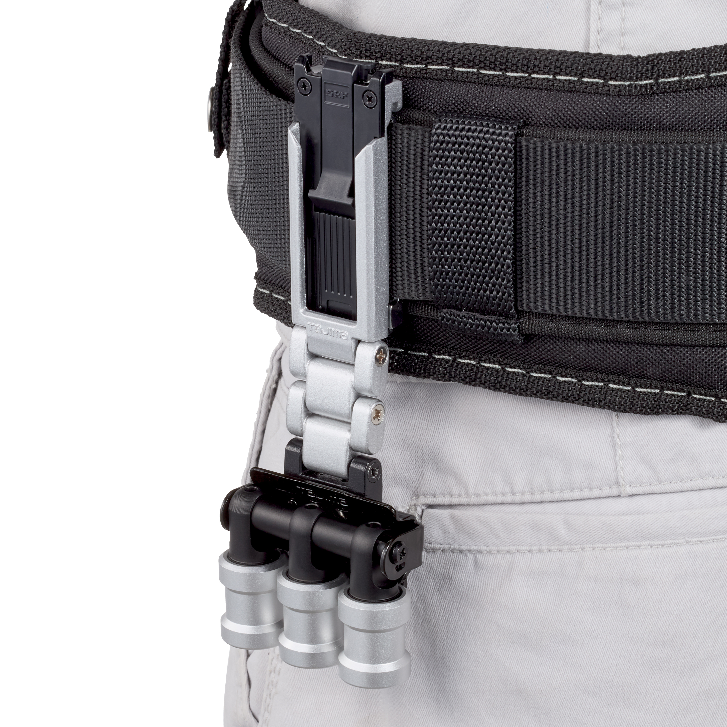 TAJIMA SFKHI-BH3 為起子頭/套筒用 3 連快扣式鋼製工具掛勾,適合電動工具作業時將常用起子頭、批頭或套筒掛在腰間,方便快速更換與取用。可搭配 TAJIMA 安全扣系統使用,也可連結於對應的客製化安全扣支架下段。