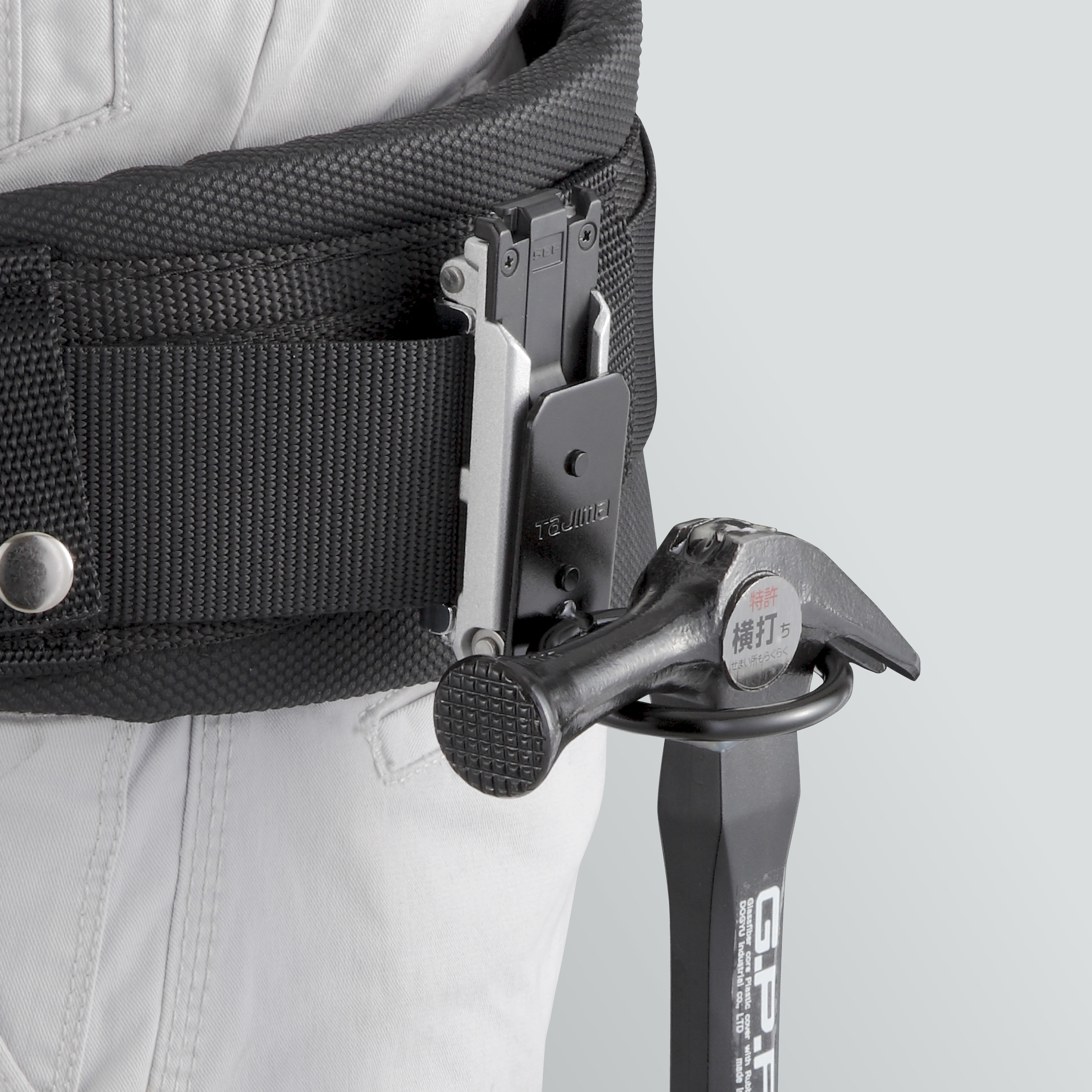 TAJIMA SFKHI-H1 為 H 型單孔快扣式鋼製工具掛勾,適合吊掛槌子、墨斗等現場常用工具。可搭配 TAJIMA 快扣安全扣系統使用,方便依照作業內容快速拆裝與調整腰帶工具配置。