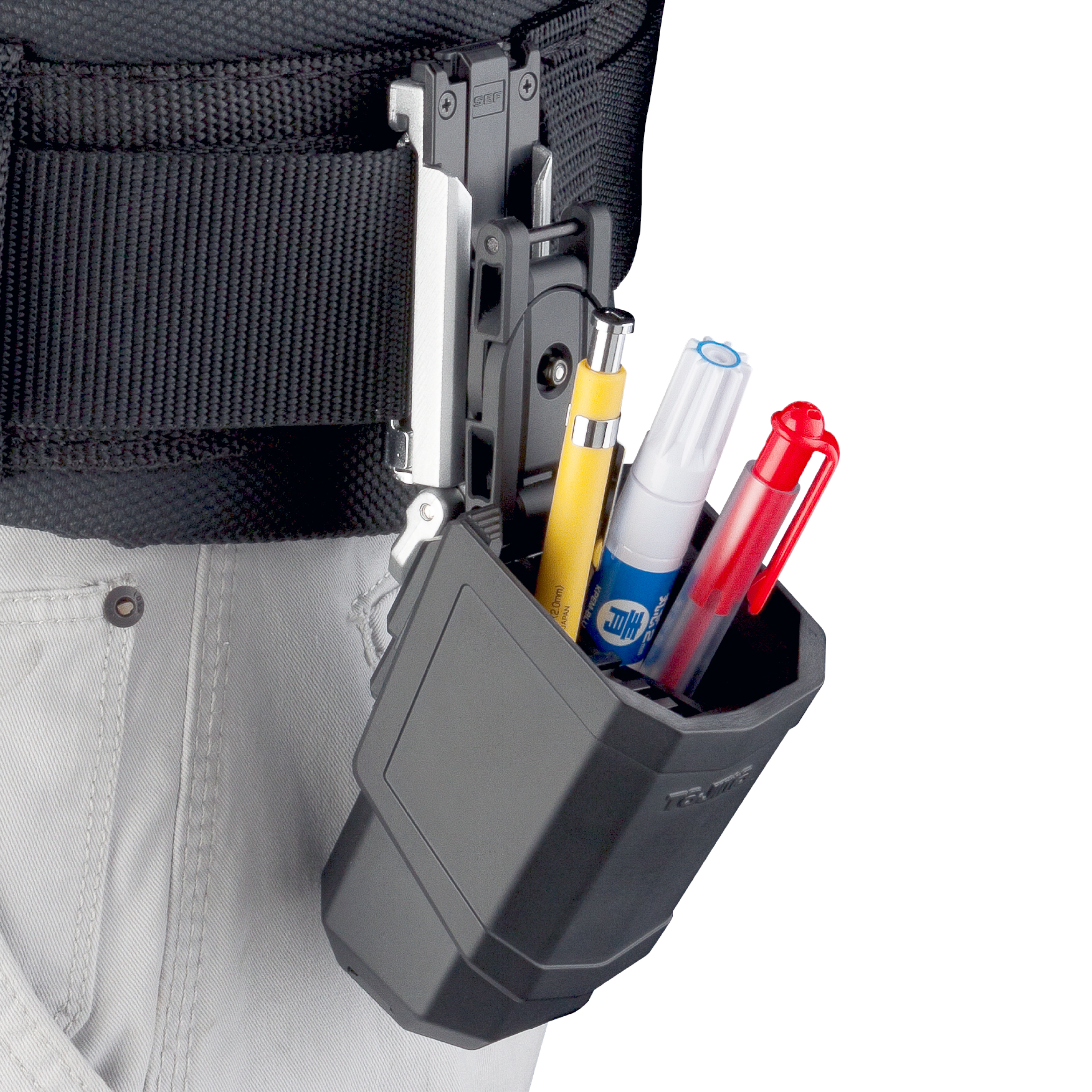 TAJIMA SFKHR-PH 為快扣式筆筒,適合收納鉛筆、奇異筆、記號筆、墨筆等現場常用書寫工具。可搭配 TAJIMA SEF 快扣系統使用,讓筆類工具固定於腰間,方便施工、測量、標記與現場作業時快速取用。