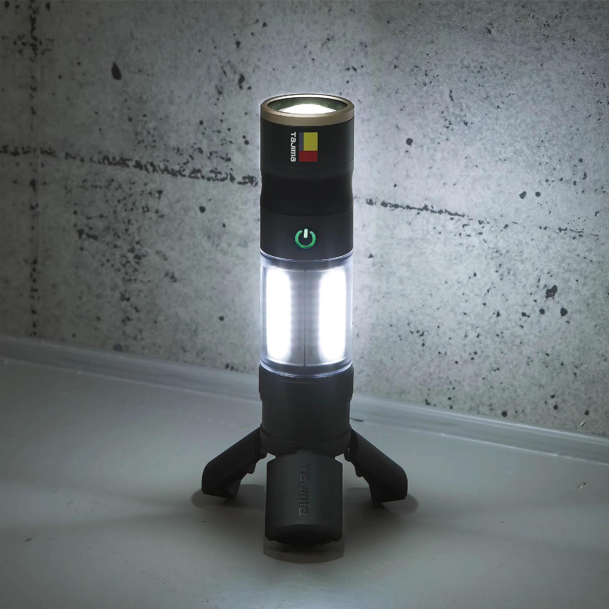 TAJIMA 快扣式手持工作營燈 KJL 1000lm 3747SET,適合工地施工、水電維修、裝潢工程、設備檢修、倉庫作業、戶外工作與露營照明使用。最大亮度 1000lm,可同時照亮天面與水平全周,提供大範圍工作照明。
