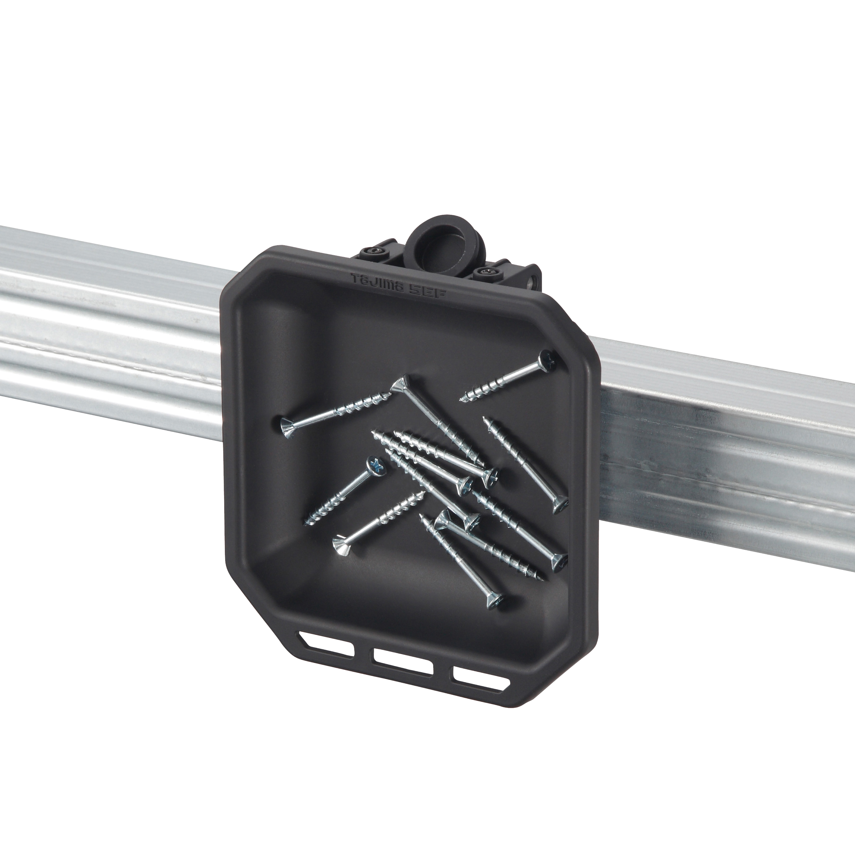 本款內建磁鐵,可吸附在鐵骨、LGS 輕鋼架等金屬表面,讓施工時零件可就近放置。背面設有 SEF 快扣掛鉤,方便裝在腰部或 SEF 工具箱上使用;背面橡膠防滑設計,即使吸附於垂直面也能降低滑動。內底 R 型設計,螺絲與小零件更好拿取。