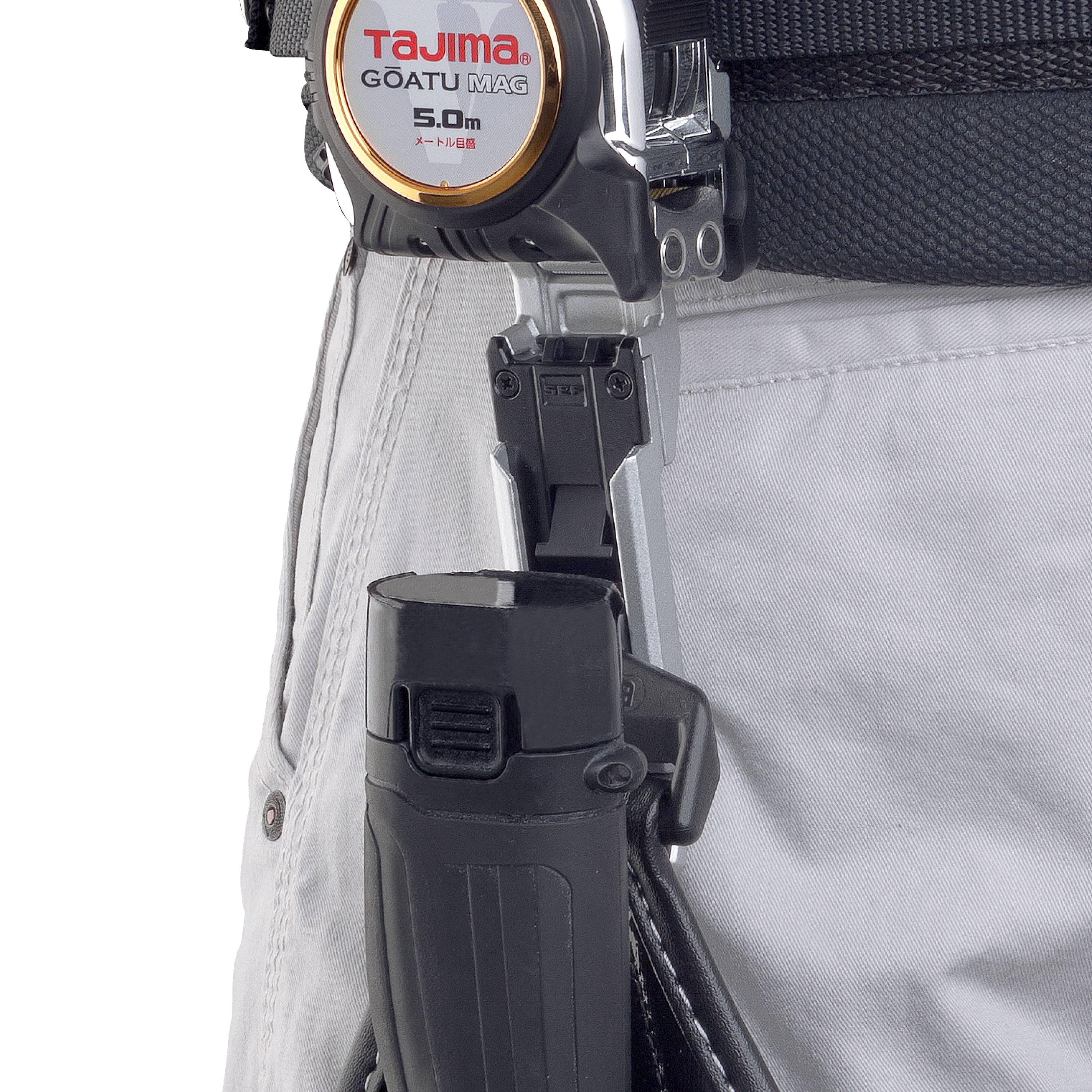 適合木工、裝修、電工、鐵工、工程施工與現場作業人員,用於擴充 TAJIMA Custom 安全扣系統的下段工具收納位置,讓腰帶工具配置更靈活,也適合需要金屬材質耐用性的使用者。