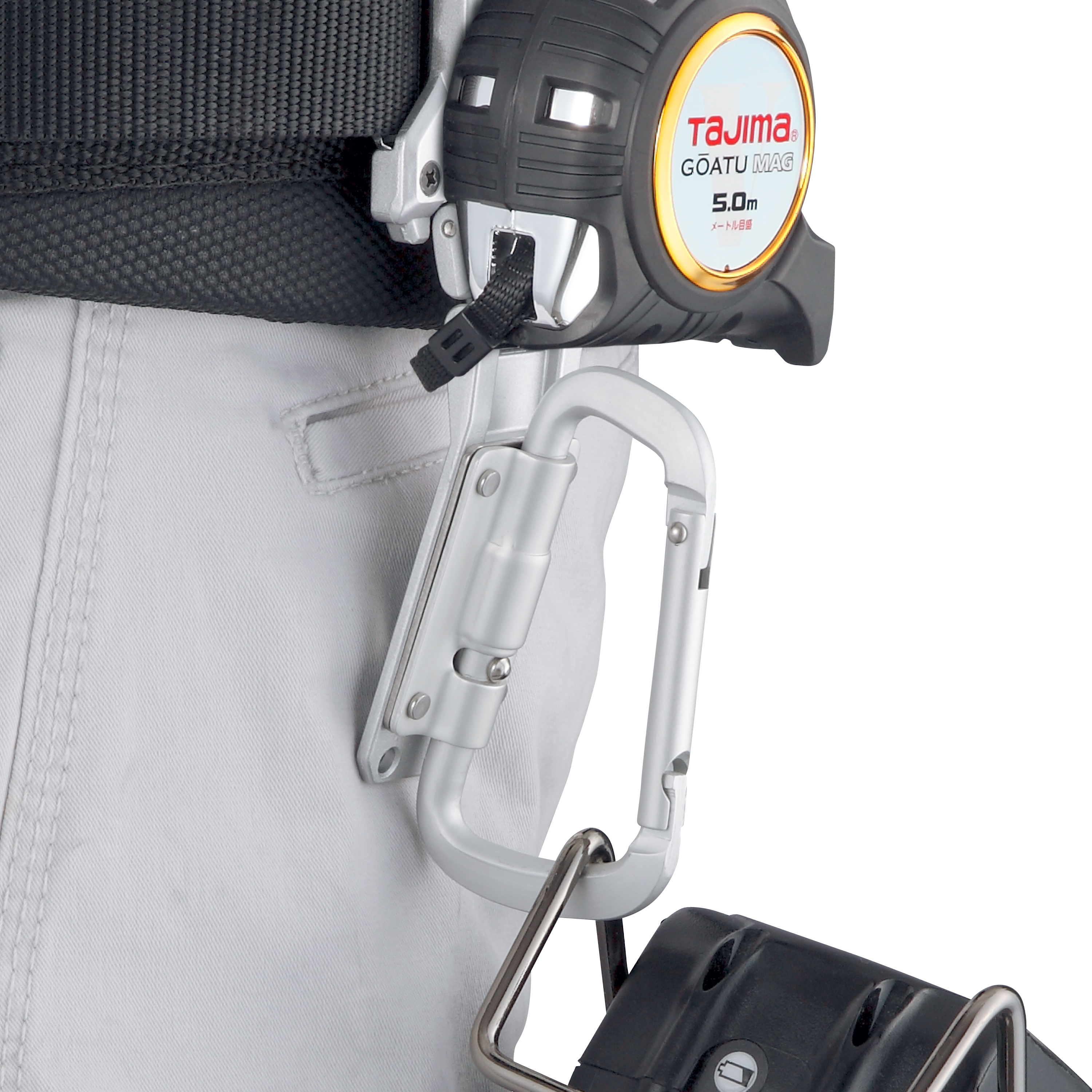 適合木工、裝修、電工、鐵工、工程施工與現場作業人員,用於 TAJIMA Custom 安全扣系統的下段工具掛放配置,可吊掛衝擊起子機、扳手等常用工具,讓腰帶工具收納更靈活。