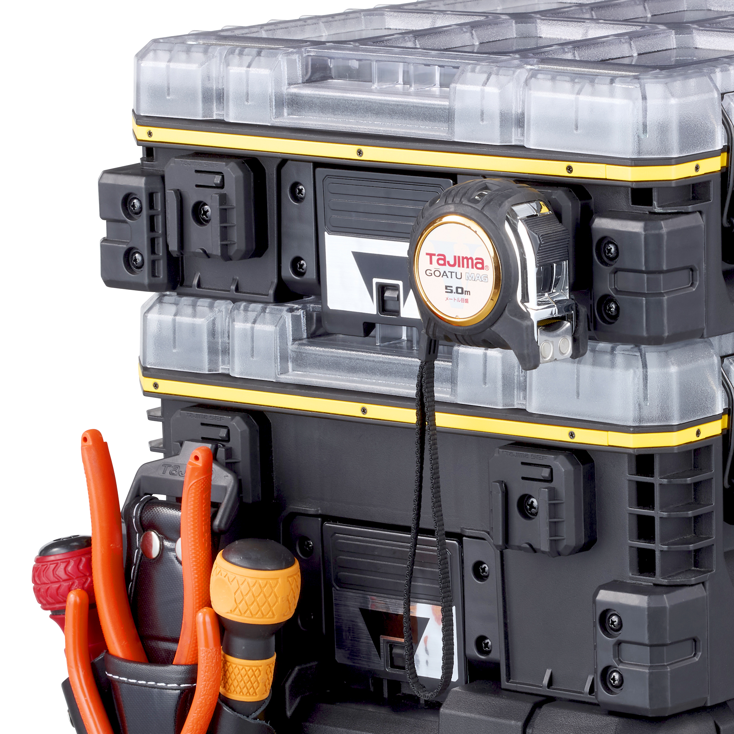 TAJIMA TB-PBOX 為快扣式零件提箱,適合收納工具、小型零件與小型電動工具。透明上蓋搭配可拆裝分隔板設計,能快速查看內容並依需求彈性分隔,讓現場整理、攜帶與取用更加有效率。