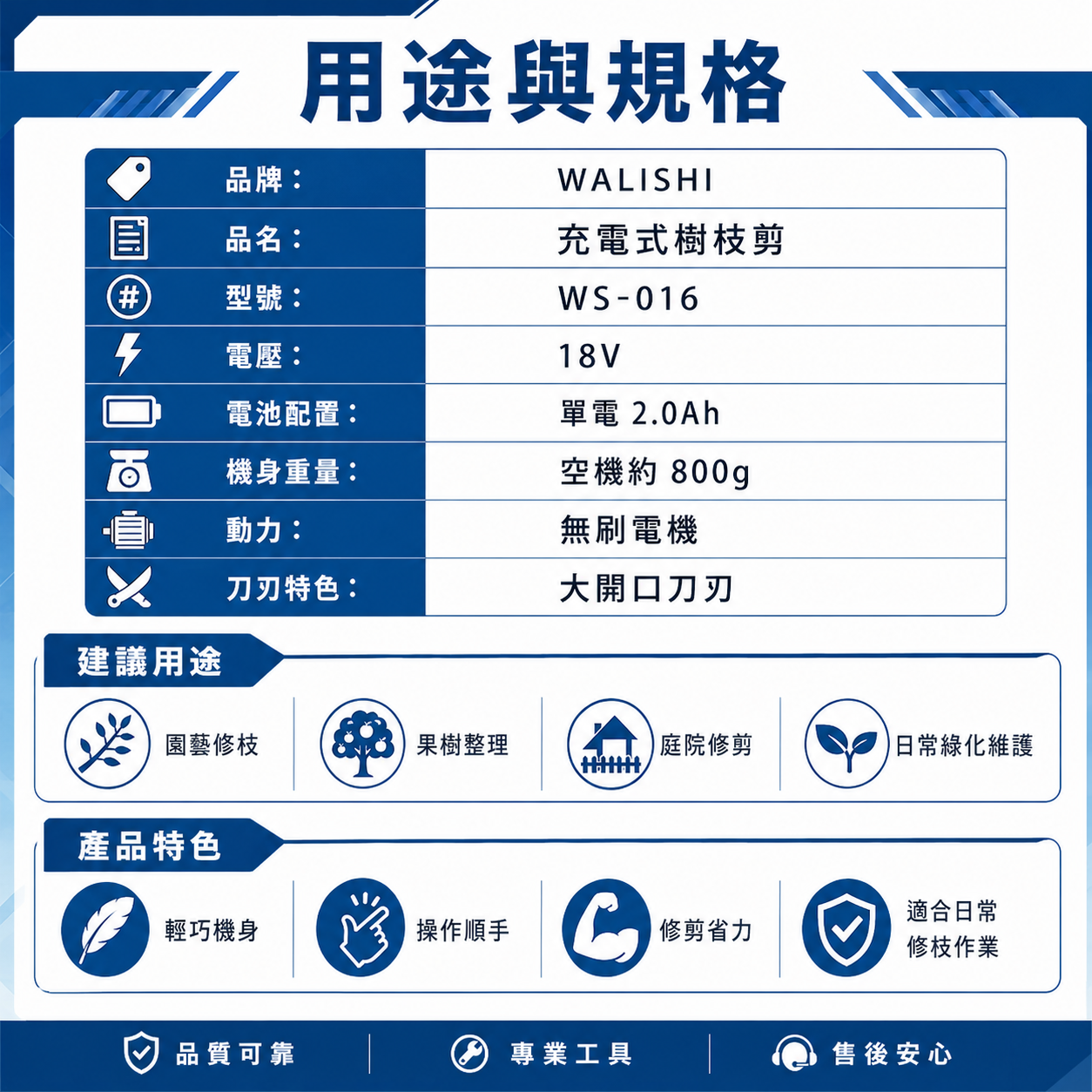 WALISHI,瓦力士,WS-016,WS016,WS 016,18V剪枝機,18V電剪,18V樹枝剪,充電式剪枝機,鋰電剪枝機,無刷剪枝機,電動剪枝剪,電動樹枝剪,單電2.0,2.0Ah電池,15mm,25mm,35mm,園藝修枝,果樹修剪