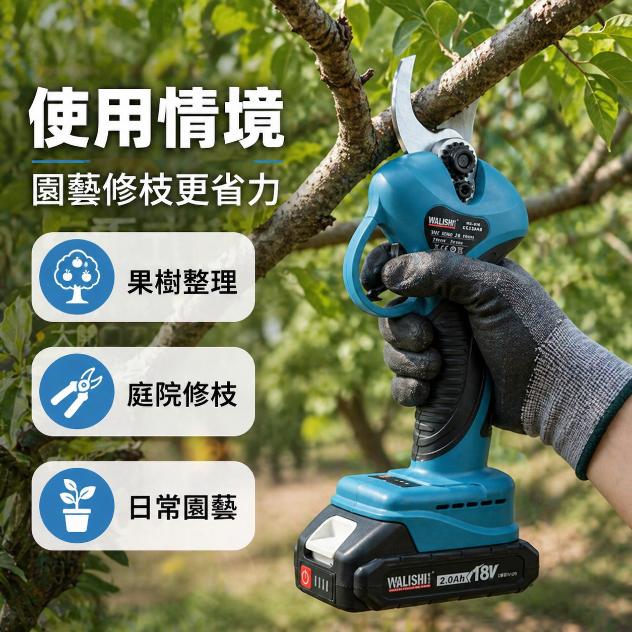 WALISHI 18V剪枝機為充電式鋰電樹枝剪,適合果樹修剪、花木整理、庭院修枝、農園管理與一般園藝作業使用。電動剪枝設計可降低手部施力負擔,長時間修剪也更省力。