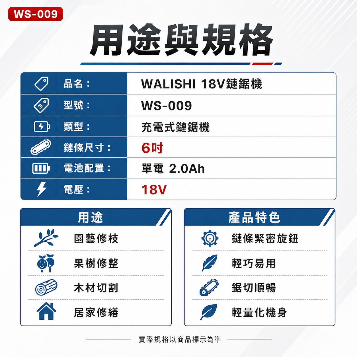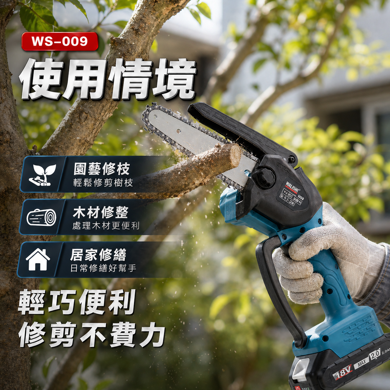 WALISHI,瓦力士,WS009,WS-009,18V鏈鋸機,18V電鏈鋸,6吋鏈鋸,6寸鏈鋸,6吋電鋸,單電2.0,2.0Ah電池,充電式鏈鋸,鋰電鏈鋸,園藝修枝,高枝修剪,2.5米延長桿,伸縮桿另購,砍竹,木材切割